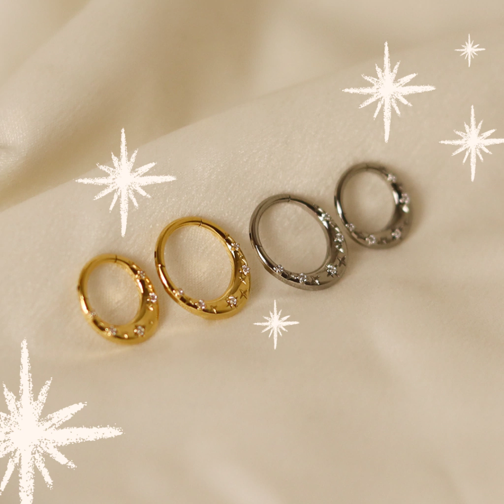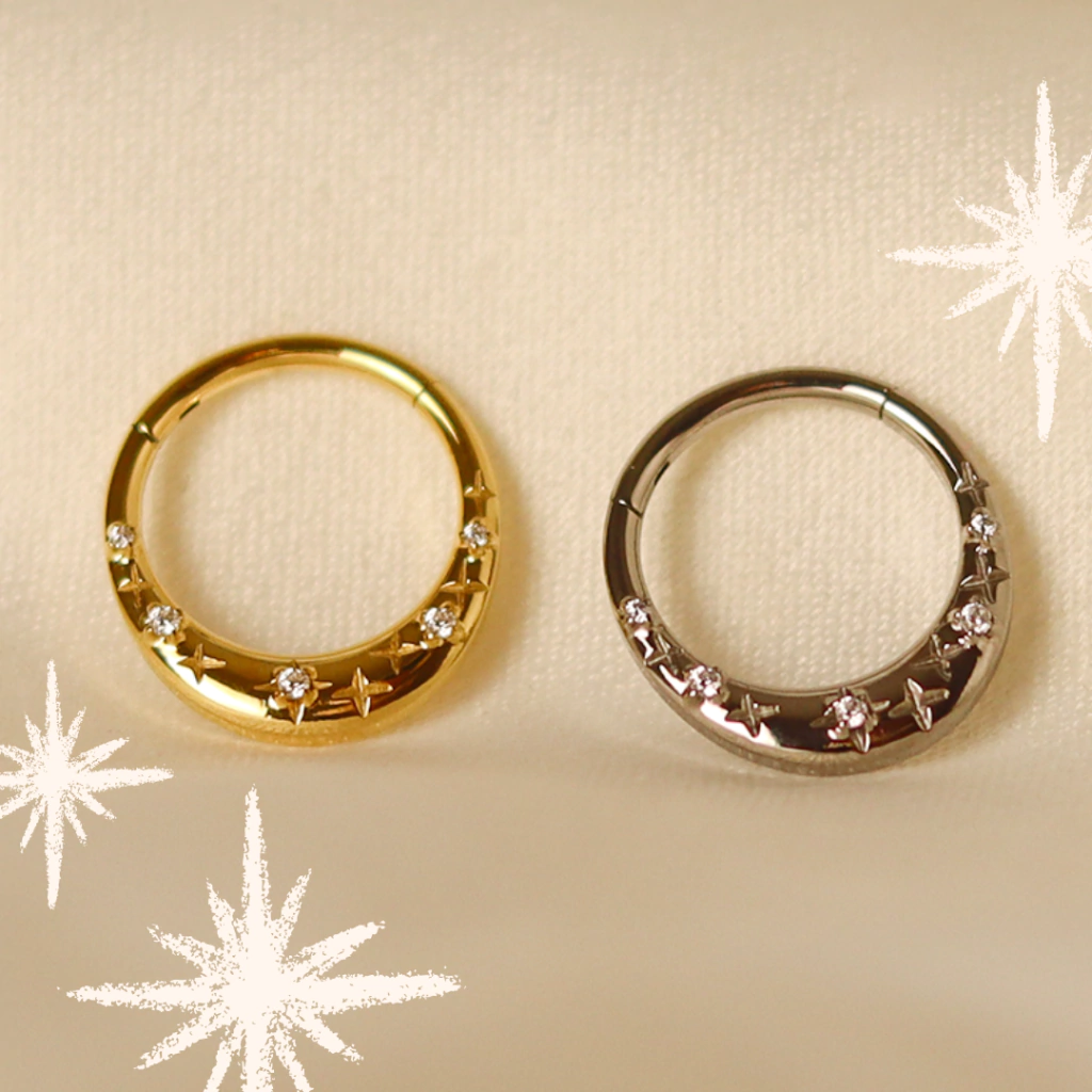 Essa argola representa o conhecimento dos elfos sobre o céu. Eles tem profundo conhecimento dos astros e se baseiam neles para o plantio, previsões e também sua magia. Essa argola é a coisa mais linda. Ela tem equilíbrio entre o seu formato que traz volume e é anatômico, com a delicadeza dos cravejados com as estrelas em baixo relevo. Disponível no prata e dourado, com 8mm e 10mm . Ela fica sensacional no lóbulo, helix, daith e septo.