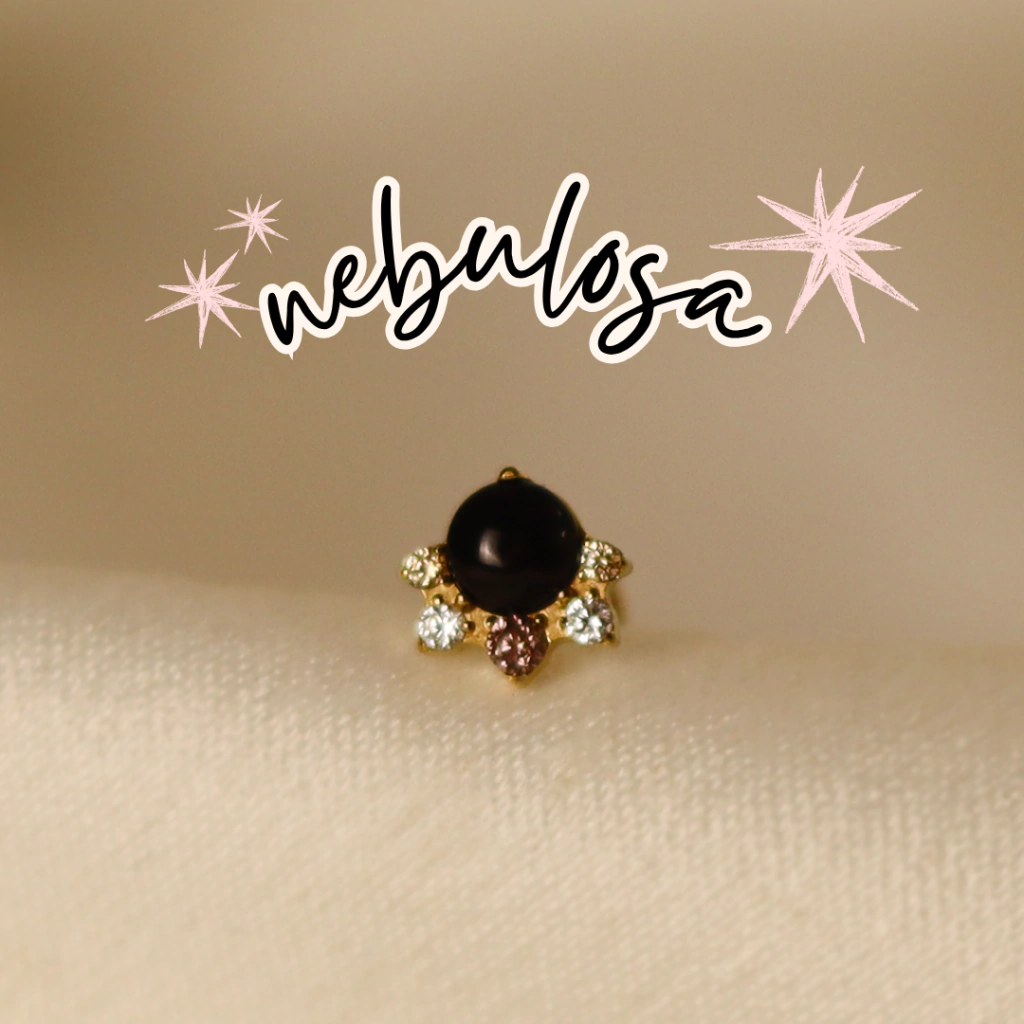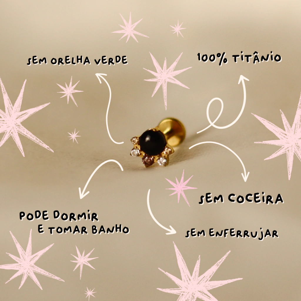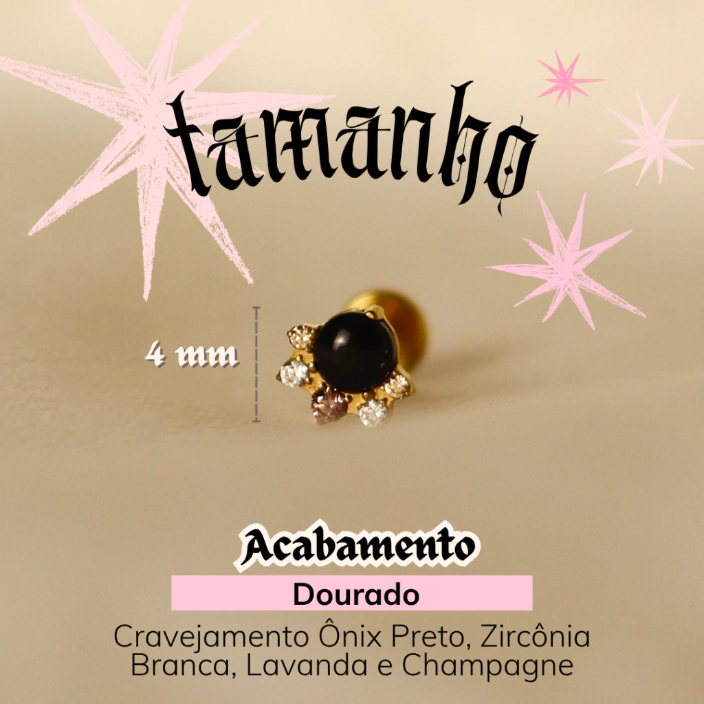 Super delicada! O contraste do ônix preto com os mini cravejamentos lavanda e champagne são o ponto alto dessa bebezinha. Essa peça serve para composições sóbrias e também pras mais divertidas, ela é super versátil. Disponível no dourado. Ela fica ótima em quase todas as perfurações.